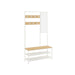 Farbe: Eichenfarben-Weiß Material: Holzspanplatte, Stahl Größe: 35 x 98 x 180 cm (T x B x H) Gewicht: 15,9 kg Max. statische Belastbarkeit pro Haken: 5 kg Max. statische Belastbarkeit pro Gitterablage: 15 kg Max. statische Belastbarkeit der Sitzfläche: 100 kg