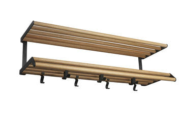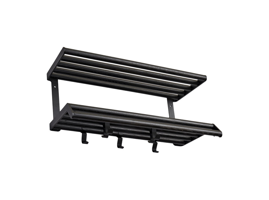 Die Tamburin-Produktfamilie wurde Teil von Andreas Klippinges Zielsetzung einer Zeichnung von etwas „Superfunktionellem“. Die Wahl fiel auf die Hutablage, die in schwedischen Häusern ein wesentliches und absolut unverzichtbares Element ist, da das skandinavische Klima mit den jahreszeitlich bedingten starken Schwankungen hohe Anforderungen an die Flurelemente stellt. Die Hutablage Tamburin besteht aus pulverbeschichteten Stahlstangen und Haken in Kombination mit klar lackierten Rundstangen aus Eiche. Der Giebelwinkel offenbart den Charakter der zielgerichteten Schlichtheit, der Konstruktionspräzision sowie der hohen Qualität der Materialien von Tamburin. Trotz ihres eleganten Äußeren ist die Flurmöbelserie Tamburin robust. Die Breite der Hutablage von 1000 mm umfasst 4 Einzelhaken und 3 Doppelhaken. Bei der Breite von 600 mm sind es 3 Einzelhaken und 2 Doppelhaken. Eine geräumige und funktionale Hutablage, die vollständig montiert geliefert wird. Das Bild zeigt die Hutablage in der Breite von 1000 mm.