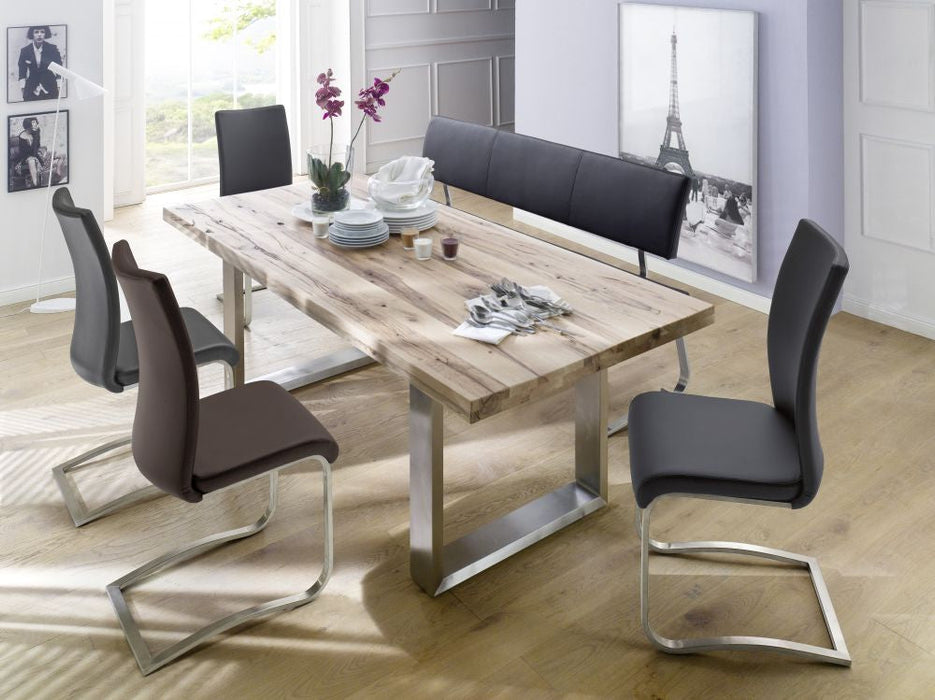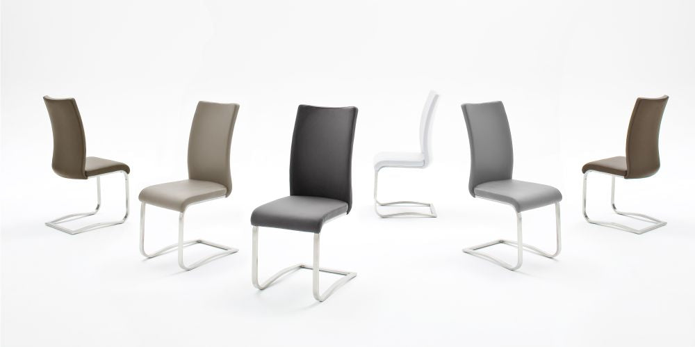 Esszimmerstühle 2er-Set mit Gestell Flachrohr in Edelstahl gebürstet. Stuhl mit pflegeleichten Kunstlederbezug. Stuhl belastbar bis maximal 130 kg. Nettogewicht ca. 9 kg. Sitzmaße BxHxT 43x48x48 cm, Stellmaß BxHxT 43x103x52 cm. Lieferung erfolgt zerlegt inkl. Aufbauanleitung