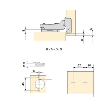 - Scharnier mit einem Durchmesser von 35 mm, öffnung 105º und Bohrung Kopf D = 3 ~ 7 mm. TürsTürke 14 bis 24 mm. Dreidimensional regulierbar und Tiefe durch Exzenter regulierba. Es verfügt über eine Feder sowohl beim Schließen als auch beim Öffnen des Scharniers und einen Kolben für das sanfte Schließen der Tür.