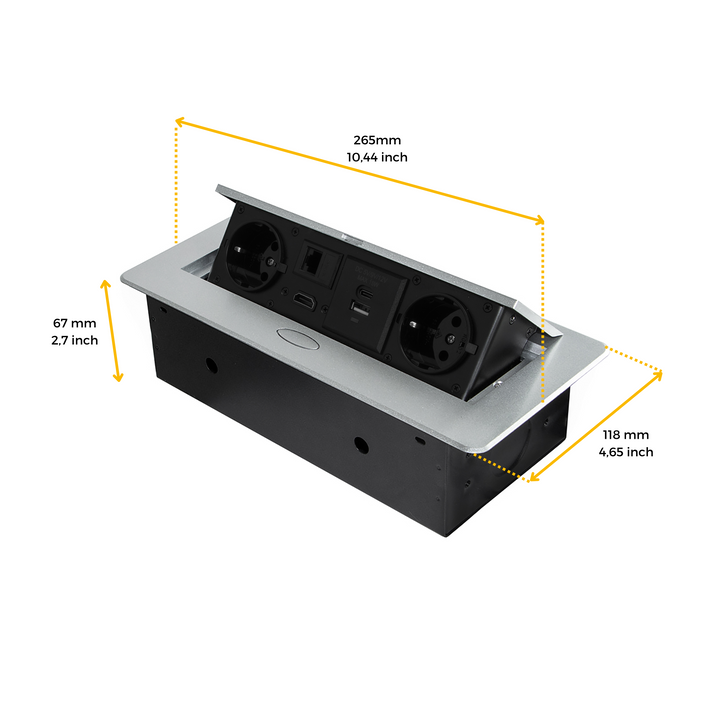 Ermöglicht äußerst vielseitige Anbringungsformen durch die enthaltenen Anschlusskabel zum Anschluss der Peripheriegeräte mit nichts weiter als einem Kabel in einer Länge von 1,5 m mit Stecker für den Betrieb bei 250V AC 50Hz. Erfordert eine Bohrung im Tisch und erlaubt die Anbringung an Oberflächen mit einer Dicke von bis zu 36 mm. Die Befestigung am Möbelstück erfolgt mit den in der Lieferung enthaltenen Winkeln und Schrauben.