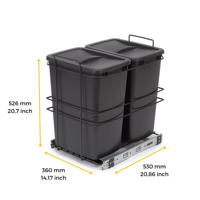 Es hat zwei Mülleimer mit einem Fassungsvermögen von je 35 Liter. Es besteht aus Stahl und Kunststoff mit einem eleganten anthrazitgrauen Finish.
