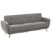 Funktionales Schlafsofa in elegantem Retro-Design, passend zur Möbelserie Jerry von Max Winzer®. Die leichtgängige Kippfunktion ermöglicht die Verwandlung zur Liegefläche mit nur einem Handgriff. Im geräumigen Bettkasten finden Decken und Kissen ihren Platz. Das Sofa überzeugt durch seine handwerkliche Verarbeitung mit Federkern in der Sitzfläche. Die Rückenpartie ist mit dekorativen Zierknöpfen versehen. Die elegant geschwungenen Armlehnen verjüngen sich nach unten und unterstreichen den Retro-Charme dieser kompakten Möbelserie. Der grob strukturierte Webstoff präsentiert sich aus einer Melange von unterschiedlichen Grautönen und verleiht dem Retro-Style einen modernen zeitgemäßen Look. Die filigranen Holzfüße aus massiver Buche verjüngen sich nach unten und unterstreichen die filigrane Optik des Sofas. Ob als Solomöbel oder als komplette Garnitur mit passendem Sessel und 2-Sitzer, Jerry ist die perfekte Wahl für alle, die ein bequemes Schlafsofa mit harmonischem Design suchen.