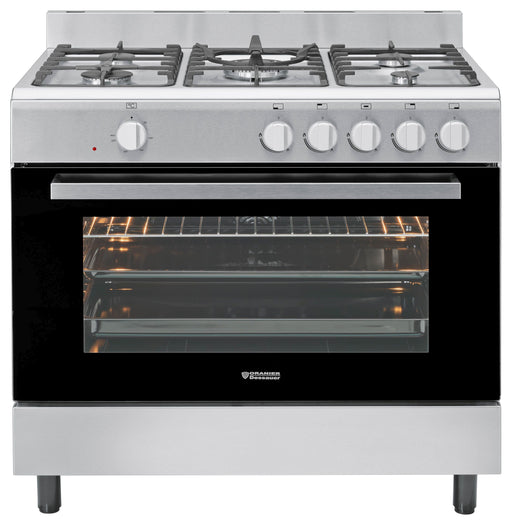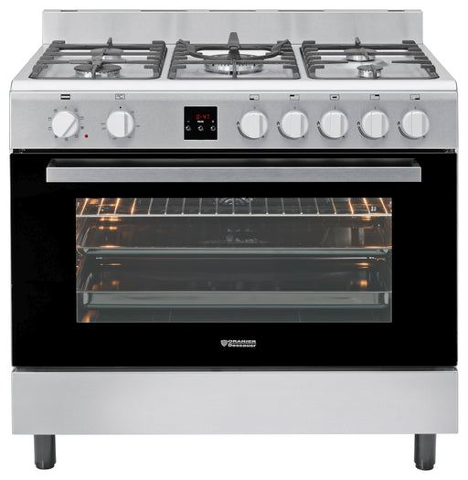 Kochzentrum Gas-Elektro, Edelstahl, 5 Kochstellenbrenner, Elektro-Backofen mit 10 Funktionen, Aufbewahrungsfach mit Klappe, 90 cm.