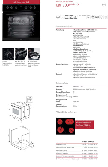 Vollständige Details anzeigenEinbauherd EBH130, 6 Fkt., XL-Backraum mit 69 L, Design Knebel, Backraumbeleuchtung, Glatte Seitenwände, Vollglas-Innentür, pureBLACK, u. v. m..