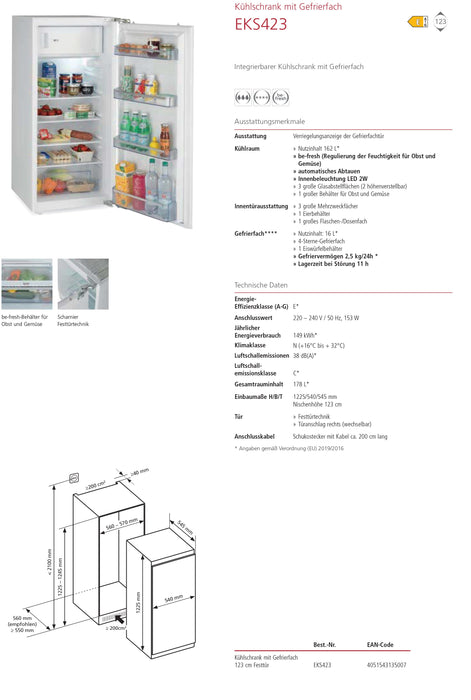 Vollständige Details anzeigenEinbaukühlschrank mit Gefrierfach, Nischenhöhe 123 mm, Schlepptürtechnik, Elektronische Steuerung, Smart-Funktion, Abtauvollautomatik, LED-Innenbel...