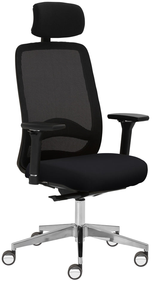 Hoher Netzrücken schwarz, extra stark gepolsterte Sitzfläche für ein Maximum an Komfort, höhenverstellbare Lordosenstütze, stufenlose Höhenverstellung, 3 Jahre Garantie, Sitzhöhe 48 - 59 cm. 4D-Armlehnen schwarz. Kopfstütze gepolstert (in Vivo 30617 schwarz). Synchronmechanik mit selbstregulierender Gewichtseinstellung und Sitztiefenverstellung. Geeignet bis 150 kg, Alu-Fußkreuz inkl. Schwerlastrollen (auch für Hartböden geeignet) und passender Gasfeder.
