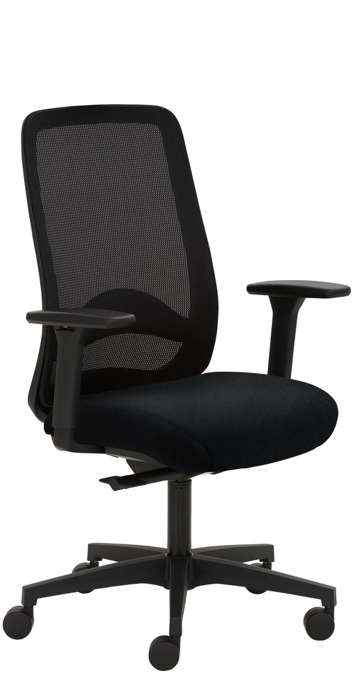 Hoher Netzrücken schwarz, extra stark gepolsterte Sitzfläche für ein Maximum an Komfort, höhenverstellbare Lordosenstütze, Kunststoff-Fußkreuz schwarz, stufenlose Höhenverstellung, Gasfeder schwarz, inkl. Rollen für Teppichböden, 3 Jahre Garantie, Stuhl GS-zertifiziert, Typ C nach DIN EN 1335-1 (belastbar bis max. 110 kg). Sitzhöhe 48 - 59 cm. Höhenverstellbare Armlehnen schwarz. Synchronmechanik mit selbstregulierender Gewichtseinstellung und Sitztiefenverstellung.