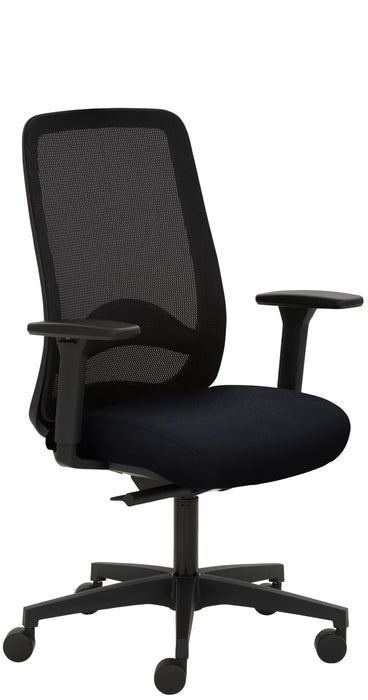 Hoher Netzrücken schwarz, extra stark gepolsterte Sitzfläche für ein Maximum an Komfort, höhenverstellbare Lordosenstütze, Kunststoff-Fußkreuz schwarz, stufenlose Höhenverstellung, Gasfeder schwarz, inkl. Rollen für Teppichböden, 3 Jahre Garantie, Stuhl GS-zertifiziert, Typ C nach DIN EN 1335-1 (belastbar bis max. 110 kg). Sitzhöhe 48 - 59 cm. 3D-Armlehnen schwarz. Synchronmechanik mit selbstregulierender Gewichtseinstellung.