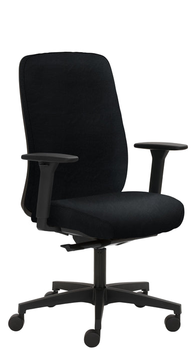 Hoher Rücken, Sitz: und Rücken gepolstert, extra stark gepolsterte Sitzfläche für ein Maximum an Komfort, höhenverstellbare Lordosenstütze, Kunststoff-Fußkreuz schwarz, stufenlose Höhenverstellung, Gasfeder schwarz, inkl. Rollen für Teppichböden, 3 Jahre Garantie, Stuhl GS-zertifiziert, Typ C nach DIN EN 1335-1 (belastbar bis max. 110 kg), Sitzhöhe 48 - 59 cm. Höhenverstellbare Armlehnen schwarz. Synchronmechanik mit selbstregulierender Gewichtseinstellung und Sitztiefenverstellung.