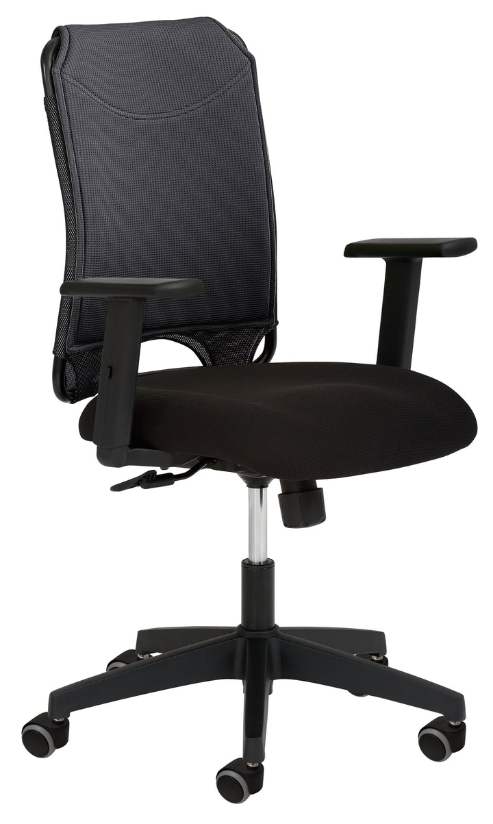 Sitz: schwarz gepolstert, Rücken atmungsaktives Elastikgewebe, Synchronmechanik mit individueller Gewichtseinstellung, Fußkreuz schwarz, stufenlose Höhenverstellung durch Gasfeder, inkl. schwarzer Hartbodenrollen, Sitzhöhe 43 - 52 cm. Rückenbezug schwarz. Inkl. höhenverstellbarer Armlehnen schwarz 8185.