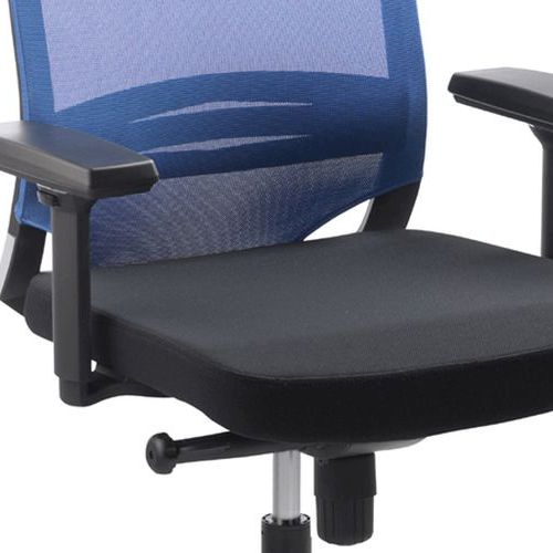 StoffpolsterSitz: schwarz, Netzrücken blau, höhenverstellbare Lendenwirbelstütze, Synchronmechanik mit individueller Gewichtseinstellung, Kunststoff-Fußkreuz schwarz, inkl. große Rollen für Teppichböden, Sitzhöhe 46 - 58 cm. Getestet nach Bürostuhlnorm EN 1335 1-3. 3 Jahre Garantie. Armlehnen mehrfach verstellbar, mit PU-Softpad.