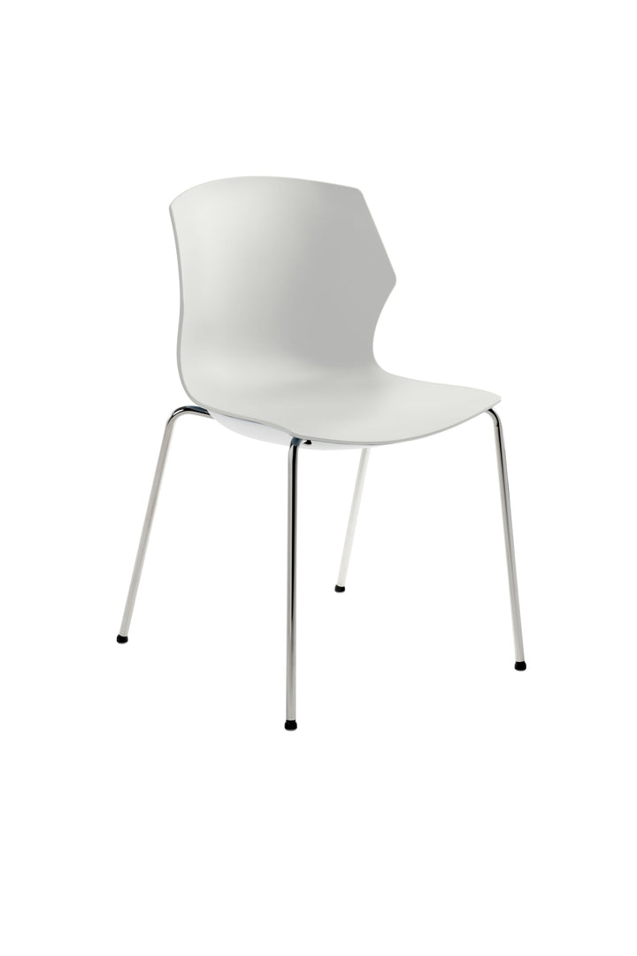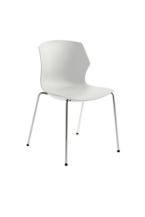 4-Fuß-Gestell Chrom, hochwertige Kunststoffschale weiß mit hohem Sitzkomfort, stapelbar (bis zu 6 Stühle), Sitzhöhe 46 cm. Belastbar bis 150 kg.