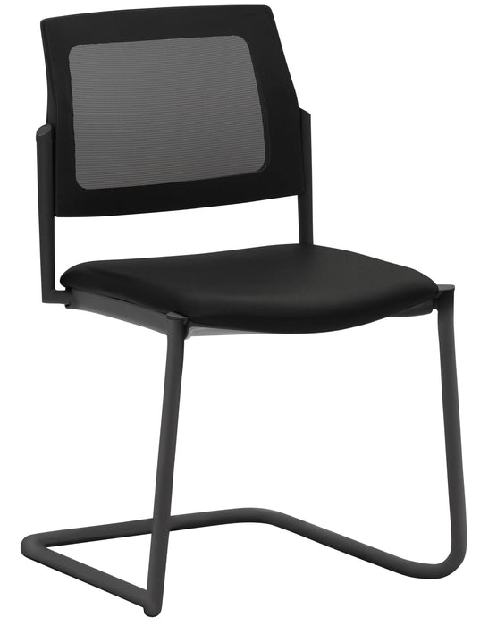 Freischwinger-Gestell schwarz, Sitz: gepolstert, Netzrücken schwarz, stapelbar (max. 4 Stühle), Sitzhöhe 47 cm.