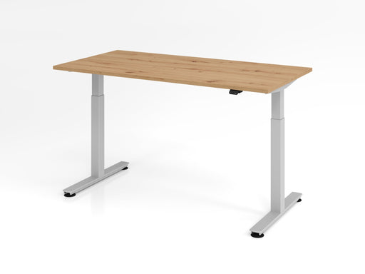 Schreibtisch XMST614, 140 x 67 cm Platte: Asteiche, 25 mm dick, 2 mm ABS-Kante Rechteckform T-Fuß Gestell in Silber, mit Tastschalter Arbeitshöhe ...