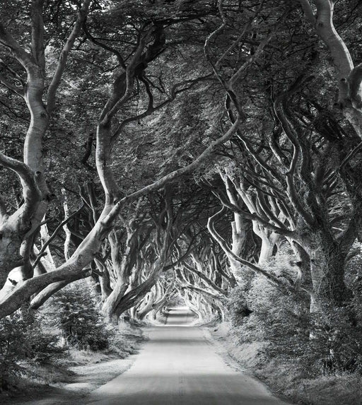 Die Dark Hedges Allee in Nordirland getaucht ins rote Morgenlicht. Die Fantastischen Silhouetten der Bäume sind faszinierend.Deutsches Qualitätsvli...