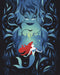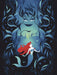 Das Bild zeigt Arielle in einer verträumten Pose, umgeben von Seegras und kühlen Blau- und Grüntönen. Im Hintergrund erscheint Ursula, bedrohlich und schemenhaft, mit einem finsteren Lächeln und ihren Tentakeln, die sich mit den Pflanzen verbinden. Die Szene vermittelt Spannung und Magie der Unterwasserwelt.