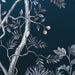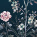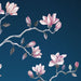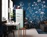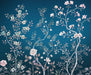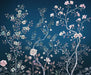 Zierliche rosa Blümchen schmücken die blauschimmernde Fototapete, die jedes Zimmereck in Szene setzt und es besonders macht.