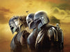 Hier stehen sie in einer epischen Reihe die Mandalorianer, die Stars des Star-Wars-Universums. Jeder Helm erzählt seine eigene Geschichte, während der goldene Himmel im Hintergrund die Szenerie in ein dramatisches Licht taucht. Es ist, als hätten sie gerade ein geheimes Mandalorianer-Treffen verlassen, bei dem sie über die neuesten Trends in Jetpacks und Beskar-Politur gesprochen haben.