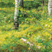 Die ersten Sonnenstrahlen des Tages lassen die Birken farbenprächtig erstrahlen.