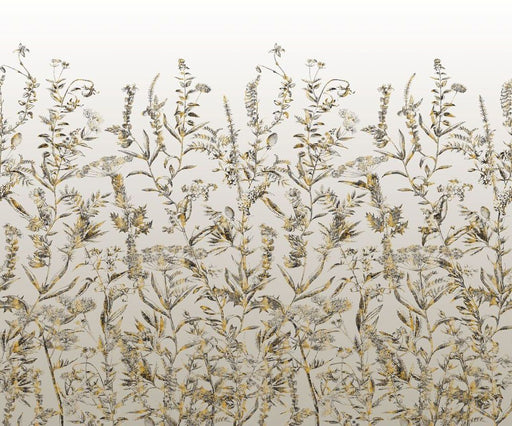 Weiße, filigrane Linien erzeugen auf dieser Design-Tapete ein künstlerisches Ambiente. Der Pflanzendruck wirkt auf dem ockerfarbenen Untergrund sac...