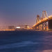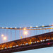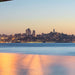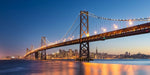 Die Skyline von San Francisco und die berühmte Bay Bridge erstrahlen in der Abenddämmerung.