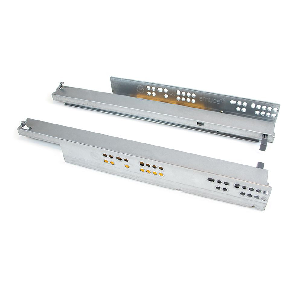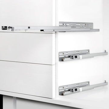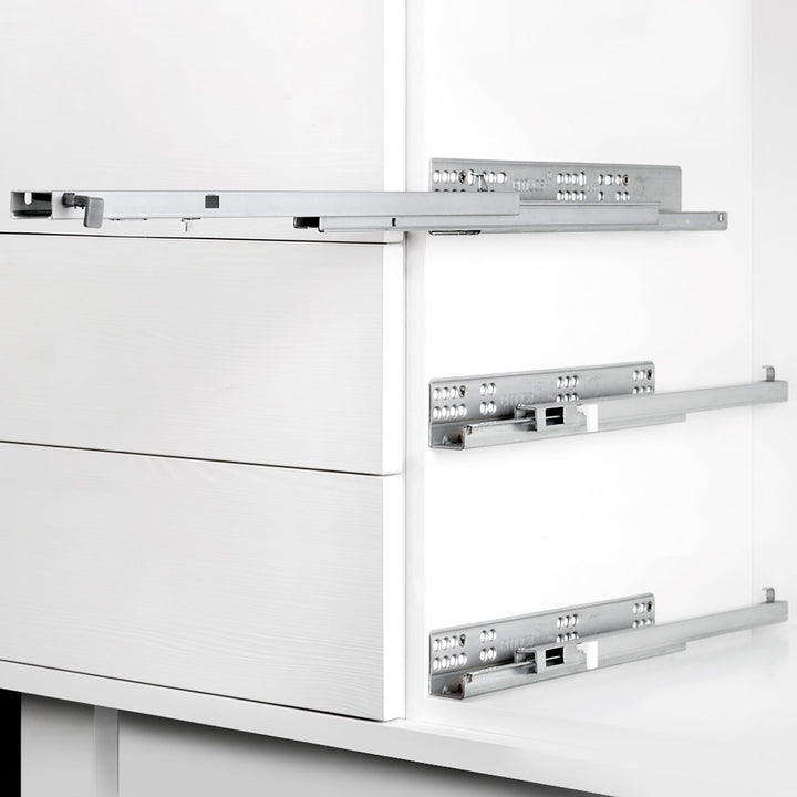 Die Silver Führungen mit den vollständigen Auszug eignen sich hervorragend für Wohnmöbel. Diese Führungen ermöglichen den vollständigen Auszug der Schublade und verfügen über ein Push-System, durch welches sich die Schublade durch Drücken öffnen lässt. Sie bestechen durch ihre Funktionalität und verfügen über einen Bremszapfen an der Führung, der das versehentliche Herausrutschen der Schublade verhindert. Sie sind aus Stahl gefertigt und bewegen sich dank der hochwertigen Delrin-Rollen, die eine horizontale oder vertikale Führung ermöglichen, sanft und leise.