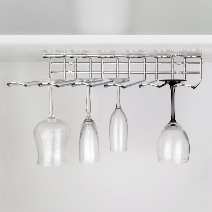Dank seines Designs aus verchromten Stahldraht passt er zu jedem Küchenstil und ist für jede Art von Glas, ob Wein-, Sekt-, Cocktail-, Kognakglas usw. geeignet. Er zeichnet sich durch seine einfache Anbringung am Möbel mittels Schrauben aus, die als Zubehör im Lieferumfang enthalten sind.