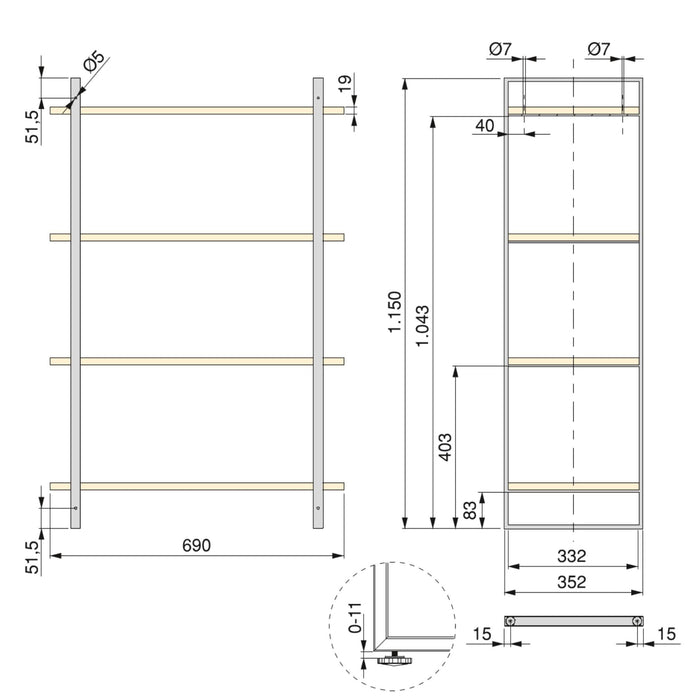 Das gesamte Zubehör für die Montage ist enthalten: 2 Gestelle, 4 Holzböden, Schrauben und Dübel (Ø6x30), um die Struktur an der Wand zu befestigen, Schrauben Ø3,5x15 in schwarzer Ausführung, um die Holzböden am Gestell zu befestigen, Kunststoffdübel, die die Befestigung der Böden an der Wand und die Nivellierer verdecken.