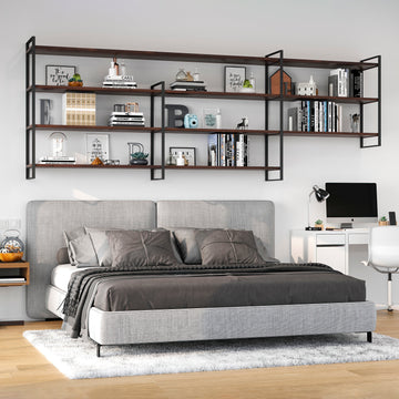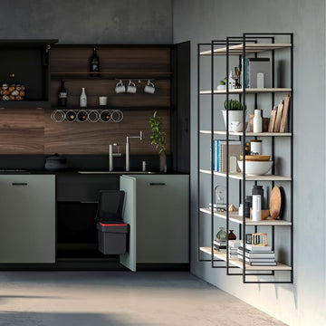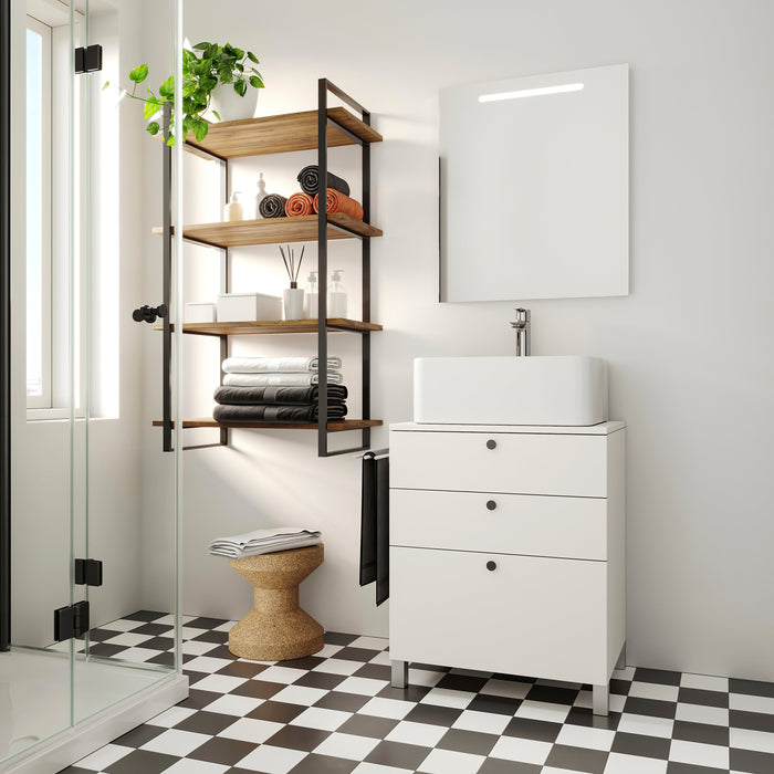 Alle Zubehörteile für die Montage sind enthalten: 2 Gestelle, Schrauben und Dübel (Ø6x30) zur Befestigung der Struktur an der Wand, Schrauben Ø3,5x15 in schwarzer Ausführung zur Befestigung der Holzböden an der Struktur, Kunststoffdübel zum Verstecken der Befestigung des Regals an der Wand. Bei den beiden höheren Gestelle sind die Nivellierer enthalten.