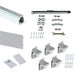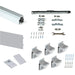 - Schienen und Frontabdeckung aus eloxiertem Aluminium in 2 Metern Länge und graue Kunststoffseitenabdeckungen.