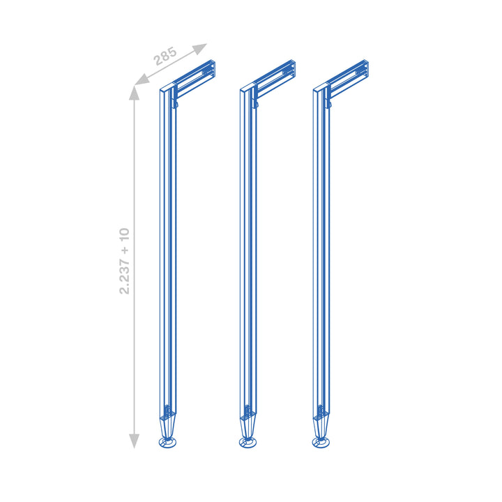 - Kompletter Satz von Profilen, um eine Zusammensetzung von 2 Öffnungen zu machen. Diese Profile müssen zusammen mit den Halterungen der Serie Zero gekauft werden, um verschiedene Kombinationen von Regalen, Modulen und Hängeschienen zu schaffen.