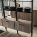 - Das Design passt sich an alle Arten von Umgebungen und Räumen an: Wohnung, Umkleideräume, Büro und Geschäfte. Kombinieren Sie das Zubehör mit den Profilen, um Ihre ideale Komposition zu schaffen: Holz- oder Glasböden, Module oder kleine Schränke und Hängestangen.