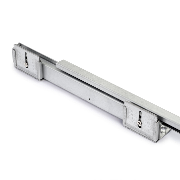 - Bausatz bestehend aus einem 483 mm breiten Schrankboden und einem breitenverstellbaren Gleitrahmen.