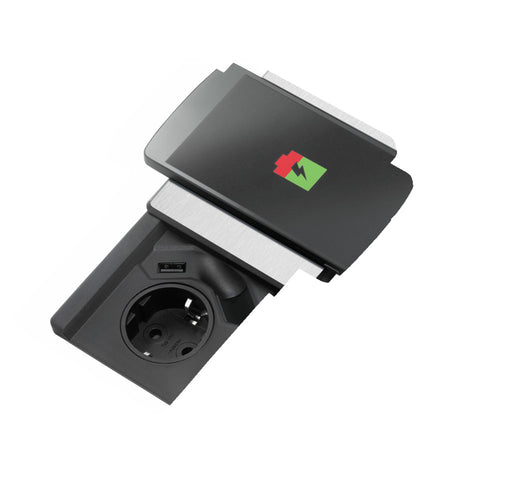 Steckdosenelement. 1-fach. Mit USB Charger (Ladestation). Geschlossen ist das Element fast eben mit der Arbeitsplatte. Durch Schieben des Deckels w...