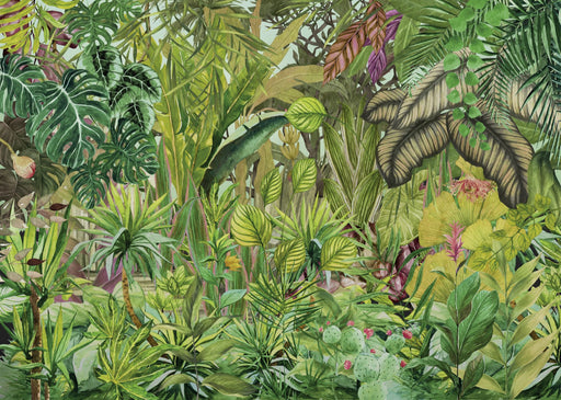 Das Tapetendesign bringt tropisches Flair Nachhause. Die leuchtenden Grüntöne und Akzente in Violett versprühen gute Laune und bringen den Dschunge...