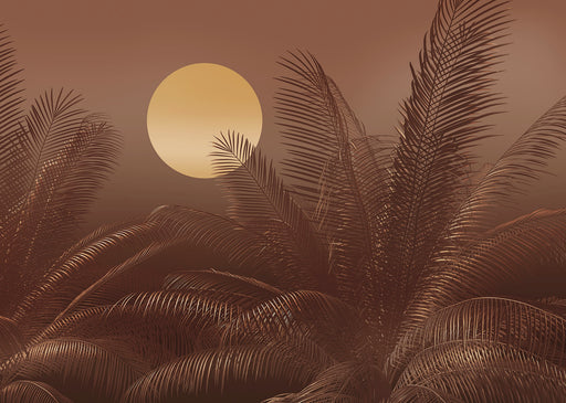 Akkurat gezeichnete Palmzweige erstrecken sich zur untergehenden Sonne empor. Oder doch eher der Mond, der bereits aufgegangen ist? Der minimalisti...