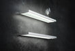 Lichtboden. Aluminiumgehäuse, edelstahlfarbig oder schwarz matt, Sicherheitsglas mattiert, mit LED Beleuchtung, gleichmäßige Ausleuchtung über die komplette Breite nach oben und unten, freihängende Anbringung bis zu einer Bodentiefe von 200 mm, Schrauben rückseitig unsichtbar zu montieren.Lichtboden mit Schalter