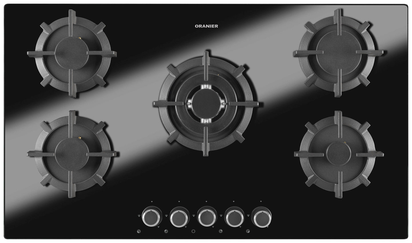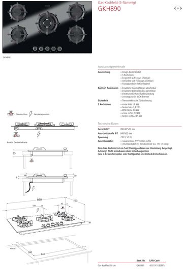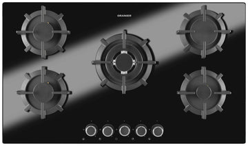 Gaskochfeld, 5- Flammig, Design-Bedienknebel, Thermoelektrische Zündsicherung, Emailierte Topfträger, Einhandzündung, u. v. m, 90 cm .