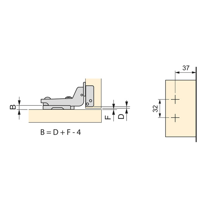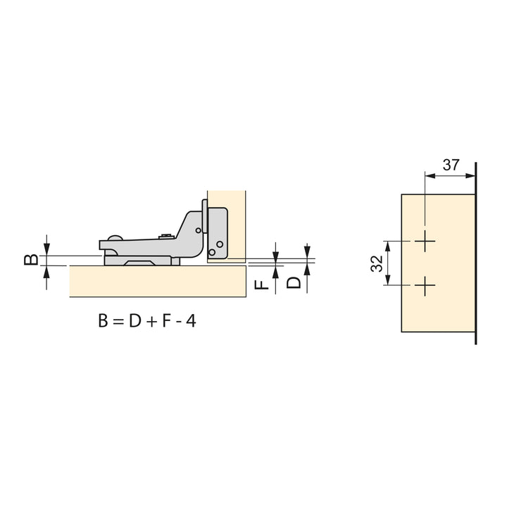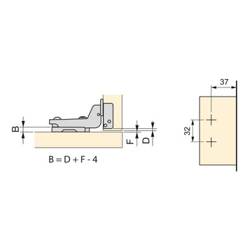 - Scharnier Innenanschlag mit weichem Verschluss, Ø35 Tasse und 105º Öffnungswinkel; gültig für Türstärken von 14 bis 24 mm.