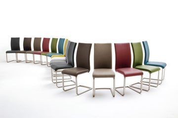 Esszimmerstühle 4er-Set in pflegeleichten Kunstleder mit Kontrastnaht in creme. Gestell Flachrohr in Edelstahl gebürstet 30x15 mm. Nettogewicht pro Stuhl ca. 8,5 kg. Sitzmaße BxHxT 42x48x46 cm, Stellmaß BxHxT 42x102x58 cm. Die Lieferung erfolgt zerlegt inkl. Aufbauanleitung.