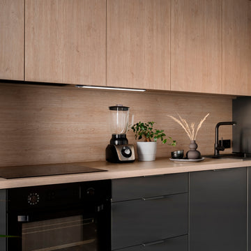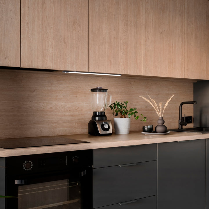 • LED-Leuchte, die eine kabellose Küchen- und Schrankbeleuchtung ermöglicht, mit einem eleganten, extra schlanken Design und einer Länge von 240 mm.