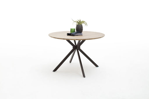 Esstisch rund mit Breite 120 cm. Tischplatte in Wildeiche Nachbildung foliert. Gestell in Kantrohr anthrazit lackiert. Überstand der Tischplatte vo...