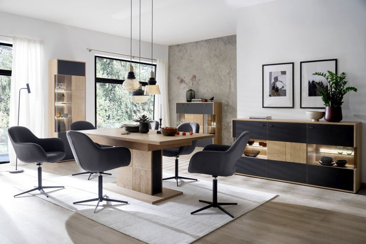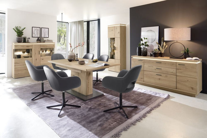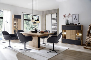 Stühle 2er-Set im Materialmix innen mit Stoffbezug in Chenille Optik und außen und Keder in Kunstleder. Esszimmerstuhl 360° drehbar mit Nivellierung. Diese sorgt dafür, das sich der Stuhl automatisch wieder in seine ursprüngliche Position dreht. Gestell Metall Oval in schwarz matt lackiert. Stuhl belastbar bis maximal 120 kg. Nettogewicht ca. 9 kg. Sitzmaß BxHxT 41x49x43 cm, Stellmaß BxHxT 64x88x64 cm. Stuhl mit Rückenöffnung für ein einfaches Handling. Die Lieferung erfolgt zerlegt inkl. Aufbauanleitung.