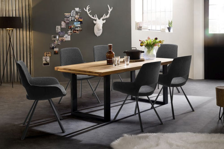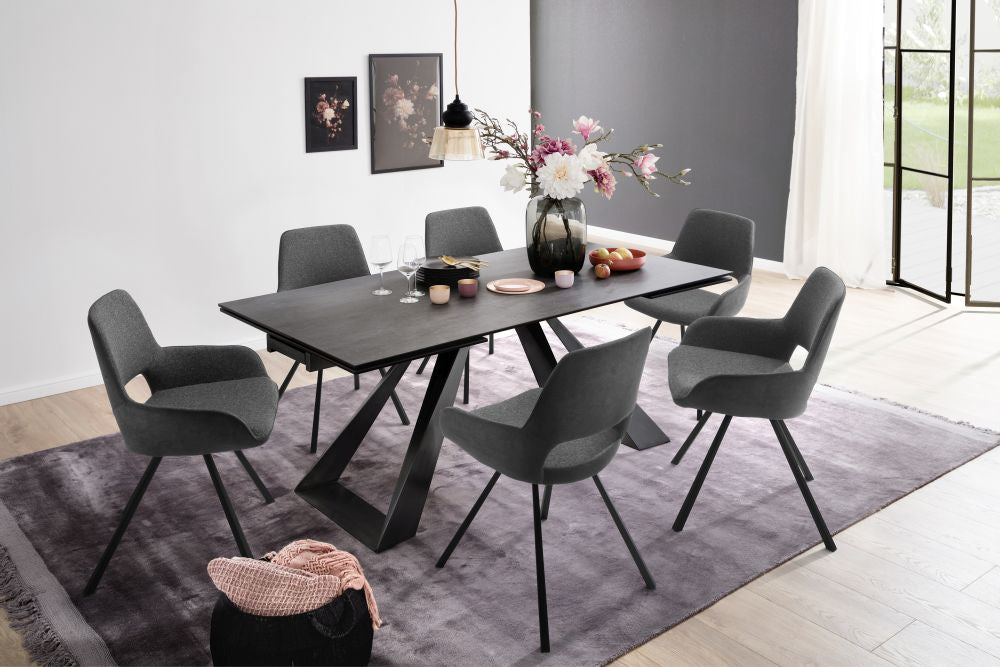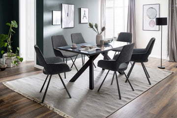 Esszimmerstühle 2er-Set mit Stoffbezug innen in Flachgewebe und außen in Feingewebe. Gestell Metall eckig konisch in anthrazit lackiert. Stuhl 180° drehbar mit Nivellierung. Diese sorgt dafür, das sich der Stuhl automatisch wieder in seine ursprüngliche Position dreht. Stuhl belastbar bis maximal 120 kg. Nettogewicht ca. 9 kg. Sitzmaße BxHxT 42x50x48 cm, Stellmaß BxHxT 59x90x61 cm. Mit Rückenöffnung für einfaches Handling. Die Lieferung erfolgt zerlegt inkl. Aufbauanleitung.