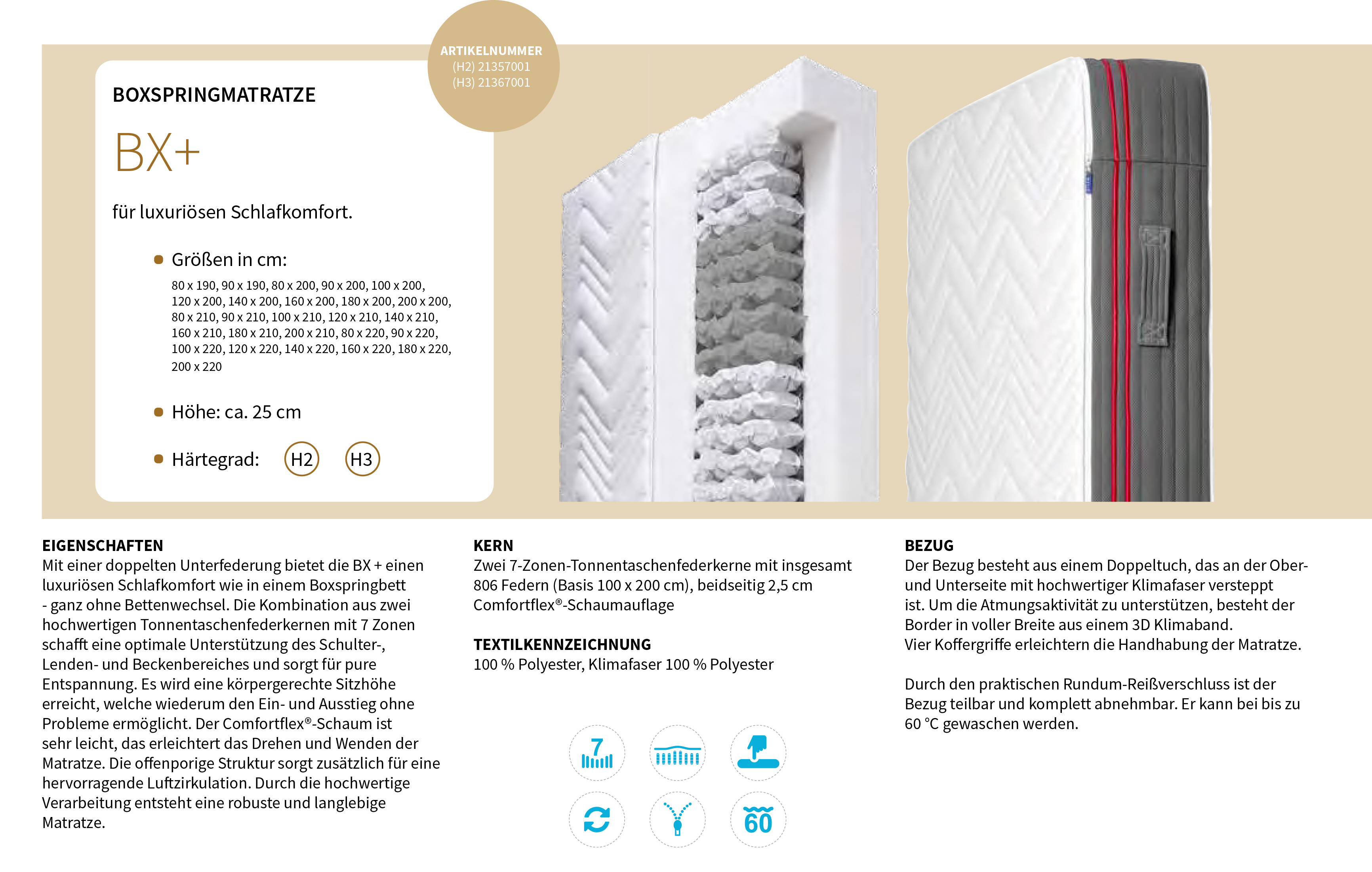 Vollständige Details anzeigenOptimale Körperanpassung auf ca. 1.000 Federn. 7-Zonen-Tonnentaschenfederkern-Matratze. Bequemer Liegekomfort durch über 1.000 Federn für optimale ...