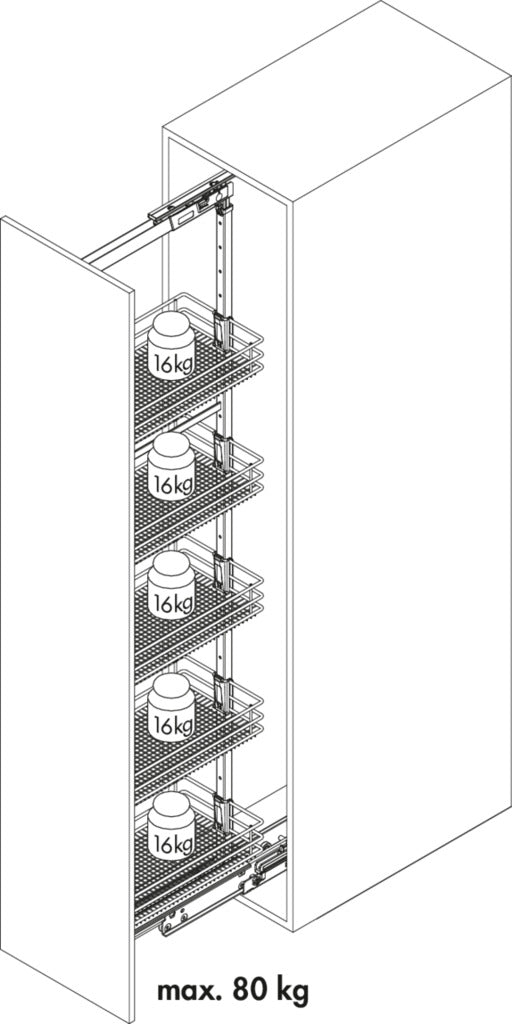 Vollständige Details anzeigenFür Hochschrankauszug VS TAL Larder. Schrankbreite 300 und 400 mm Einbautiefe mind. 503 mm Einbauhöhe 1200 bis 2140 mm Tragrahmenhöhe teleskopierb...