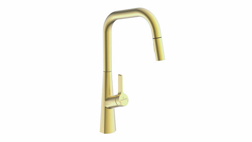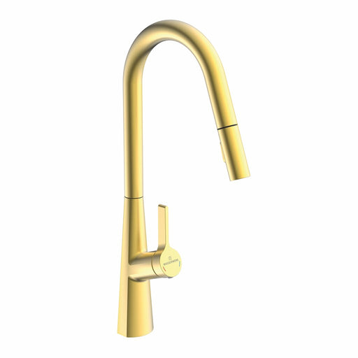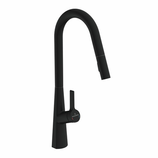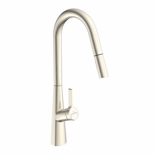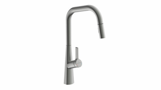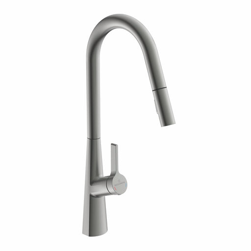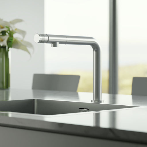 Einhebelmischer. Mit schwenk-/herausziehbarem Auslauf (Strahl/Brause umstellbar), seitlichem Hebel, Keramikkatusche. energiesparende Kaltstart-Funk...