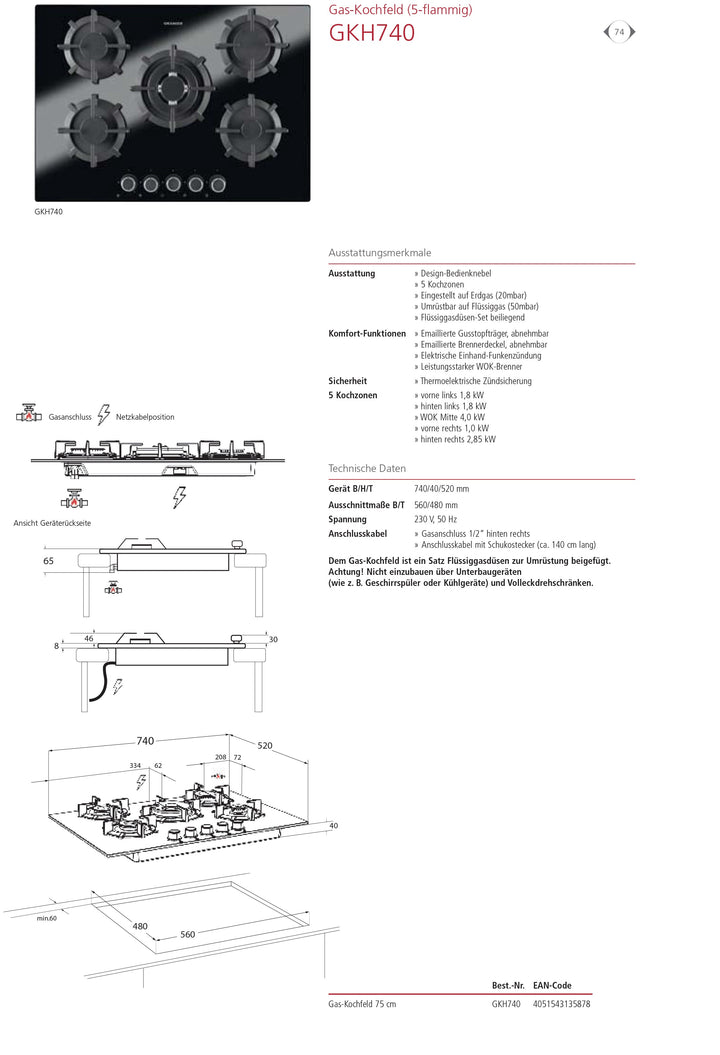 Gaskochfeld, 5- Flammig, Design-Bedienknebel, Thermoelektrische Zündsicherung, Emailierte Topfträger, Einhandzündung, u. v. m, 90 cm .