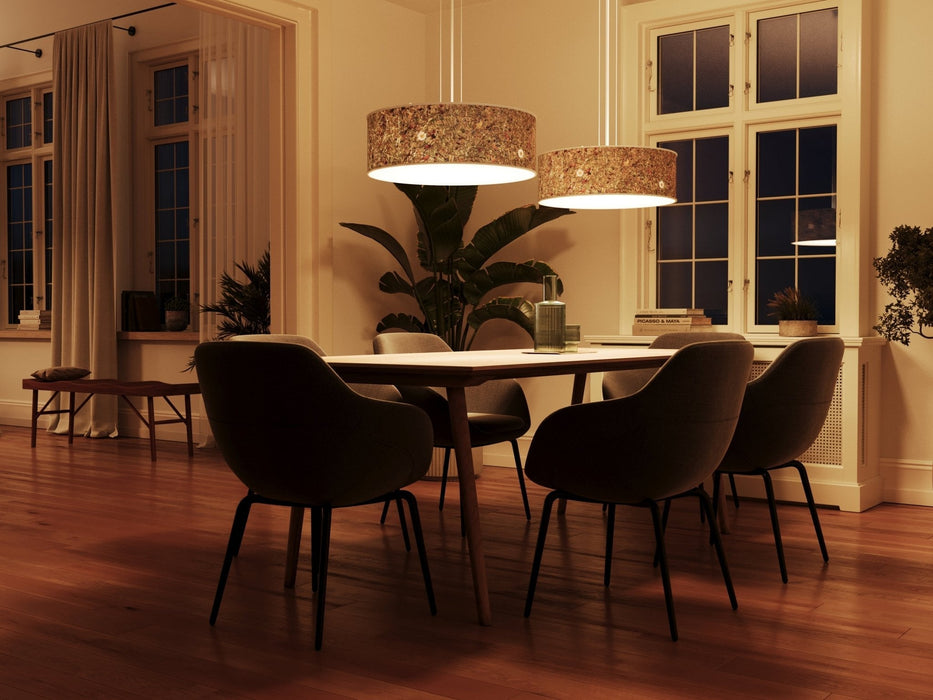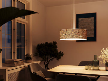 Die Pendellampen von LeuchtNatur sind wahre Einzelstücke und werden als Natur-Unikat in Deutschland gefertigt. Durch den integrierten Diffusor wird das Licht enorm homogen über Ihrem Esstisch verteilt und die Gefahr einer Blendung ist ausgeschlossen. Da die Lampe oben offen ist leuchtet diese Sowohl nach unten als auch zur Decke und sorgt so für eine ausreichende Grundillumination im Raum. Drei E27 Fassungen sorgen für mehr als ausreichend Ausleuchtung. Die Leuchte wird über 3 einstellbare Drahtseile aufgehängt, die Höhe kann so jederzeit beliebig verändert werden. LeuchtNatur empfiehlt drei LED Filamentglühbirnen mit je einer Leistung von 10 Watt in 2700 Kevin warmweiß. Mit entsprechenden Leuchtmittel dimmbar.